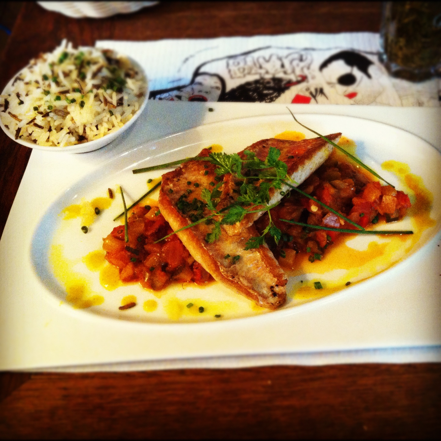 Je prends du poisson, tandis que J. prend un « King Kong » (burger). Un peu déçue par mon rouget…  il sentait un peut trop le poisson… normalement c’est pas comme ça… , décidément entre hier et aujourd’hui, ce n’est vraiment pas « mes jours ».